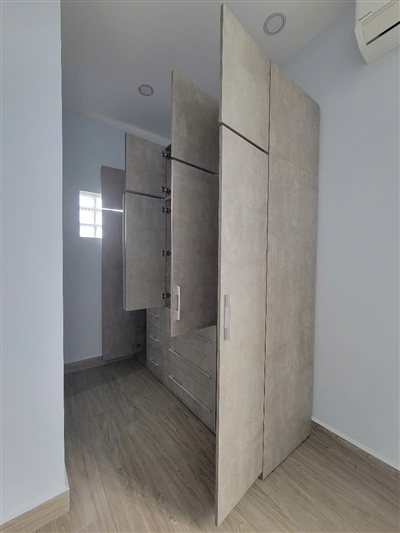 Tủ màu xi măng sang lắm, cao, chứa được nhiều đồ, tôi đỡ phải sắm thêm kệ, thợ thi công rất nhanh.