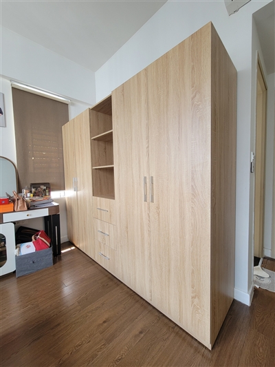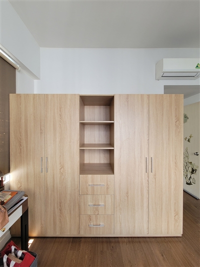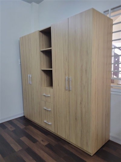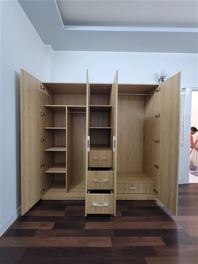 Hai bên tủ gồm có 2 khoang đôi có kích thước rất lớn.Khoang thứ nhất bên trên có một ngăn trống dùng để cất vali,mền gối…,bên dưới được chia thành 2 khoang đơn,1 bên để quần áo xếp gọn,túi xách,giày dép…, một bên có thanh treo inox dùng để treo quần áo, váy …rất tiện lợi.