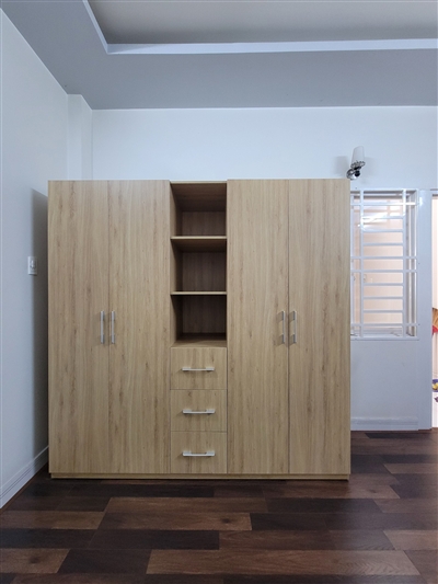 Tủ quần áo TQA-TP14 có thiết kế 4 cánh mở 2 bên, kết hợp kệ trang trí chính giữa làm điểm nhấn , dùng để trưng bày túi xách, nước hoa, sách và các đồ trang trí khác, ngoài ra tủ còn có 3 hộc kéo bên ngoài tiện dụng , đa năng chứa rất nhiều vật dụng khác.
