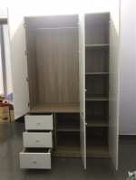 Bên trong tủ gồm 1 khoang đôi lớn và 1 khoang đơn. Khoang đôi lớn bên trên có 1 thanh treo bằng inox để treo quần áo, váy rất thoải mái, rộng rãi .