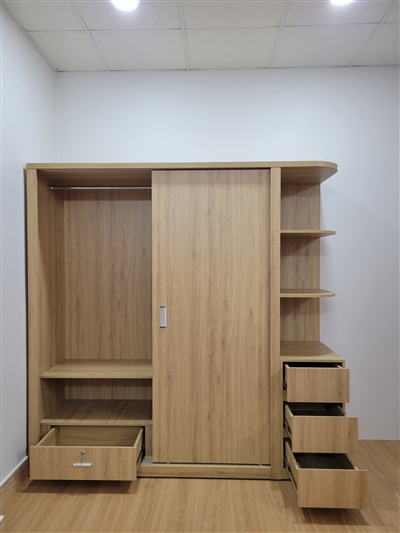 - Bên ngoài tủ có 3 hộc kéo, cung cấp không gian lưu trữ phụ và sắp xếp hợp lý cho các vật dụng cá nhân như đồ trang điểm, đồ trang sức, hoặc các bộ quần áo nhỏ.